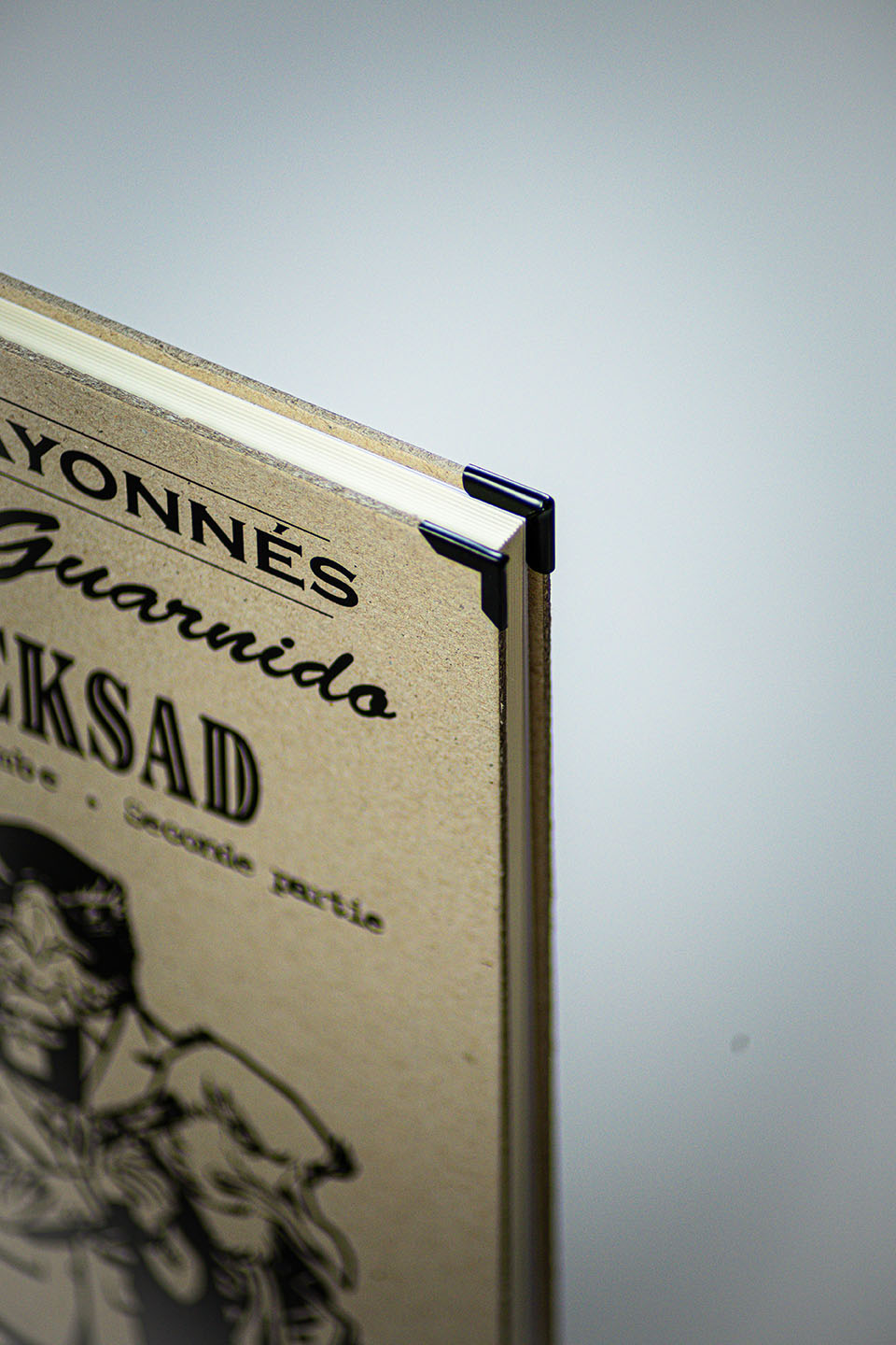 Finitions : Marquage à chaud en creux sur carton brut, coins métal.